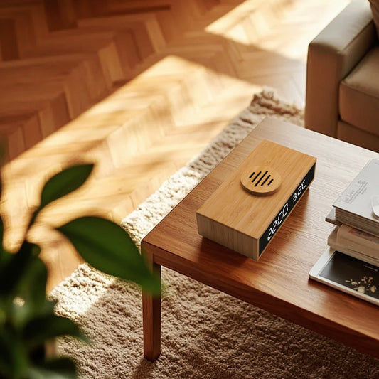 Edsonsoon MT659 Bamboo Alarm Clock with Bluetooth Speaker, Wireless Music Player, LED Nightlight, Digital Temperature & Humidity Display, Eco-Friendly Bamboo Wood Design, Silent Bedside Alarm Clock for Bedroom, Kids & Adults, Perfect Gift