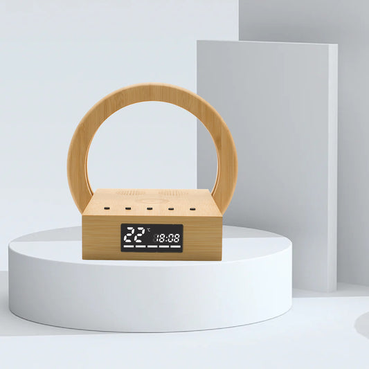 Edsonsoon MT612 4-in-1 Bamboo Smart Clock with Wireless Qi Fast Charger, Bluetooth Speaker, LED Display Alarm Clock, Multifunctional Wood Digital Clock for Bedroom, Office, Nightstand, Eco-Friendly Modern Design