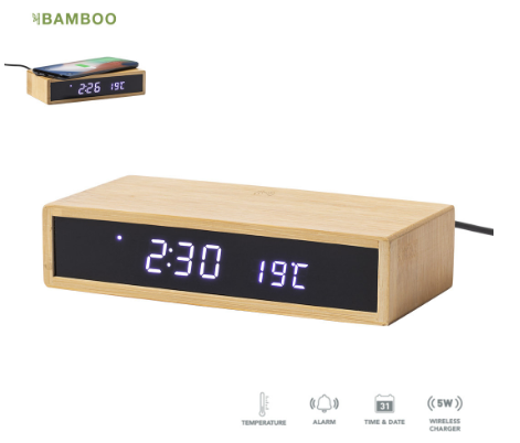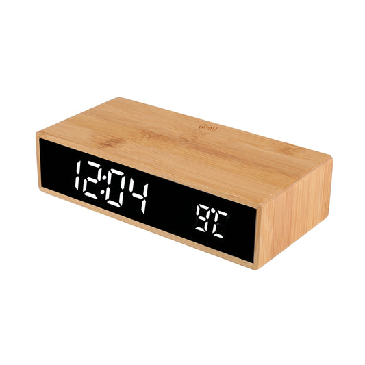 Edsonsoon MT526 Bamboo Wireless Charging Alarm Clock – Eco-Friendly Fast Qi Charger with Time, Date & Temperature Display