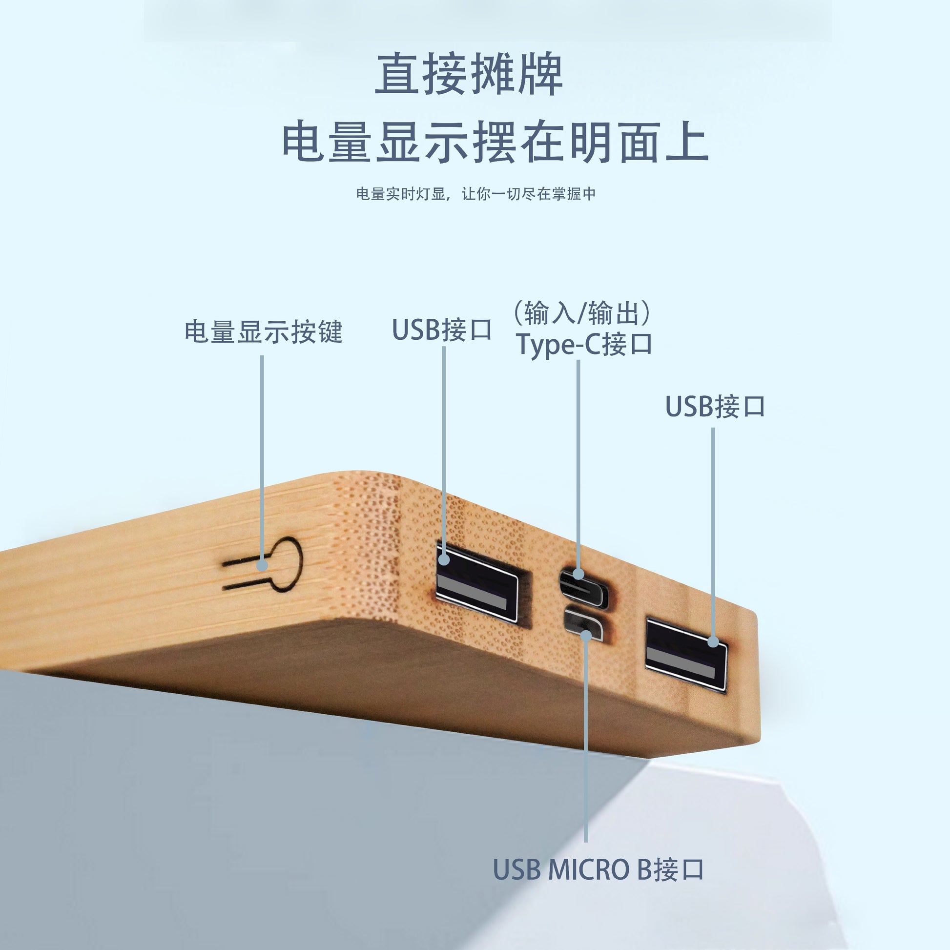 Crafted from natural bamboo, this portable charger delivers reliable power with your choice of 5000mAh or 10000mAh capacity. Designed for versatility, it features dual USB outputs to charge multiple devices simultaneously, along with Type-C input/output and Micro USB support for wide compatibility.
