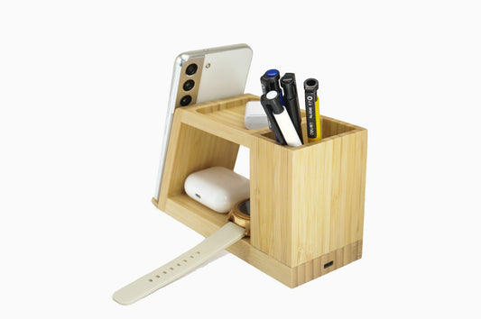 Edsonsoon MT548 Bamboo Wireless Charger with Pen Stand, Phone Holder, Table Lamp & Desk Organizer – Multi-Function Charging Station for iPhone, Samsung & Qi Devices